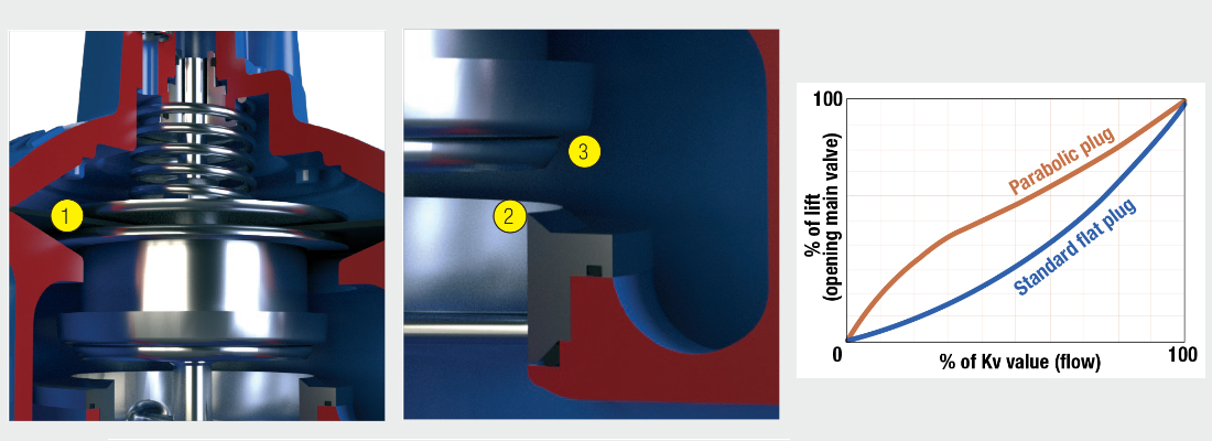 Paraboliczna konstrukcja wtyczki regulującej (3) zapewnia precyzyjną regulację i stabilność przy niskim przepływie. Ponadto zmniejsza hałas i wibracje.